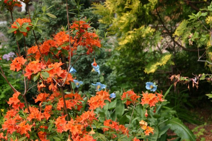 Описание Листопадный кустарник,кора бурая. Молодые побеги покрыты мелкими щетинистыми волосками. Листья продолговатые, 4-12 см длиной, 1,5-4 см шириной, летом зелёные, осенью оранжевые или карминово-красные. Цветки воронковидные, жёлто-оранжевые, оранжевые до тёмно-красных, диаметром 5 см, собраны по 5-7 штук в соцветии, распускаются одновременно с листьями. Окраска цветков рододендрона схожа с окраской лепестков календулы (ноготков), отсюда такое название. Особенно декоративен во время цветения и осенью благодаря красочной окраске листьев. Использован в селекции при создании новых сортов.